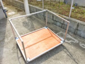アルミフレームやアルミパイプの組立ては六角ボルトを締めこむだけの簡単作業です。六角レンチ1本あれば全てを組み立てることができます。ウチの小学2年生の子供でもこの通り。誰が作っても同じように組みあがるので技術が要らず、初めての方やDIYしない人も安心して利用できます。